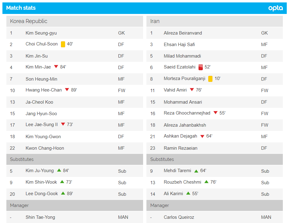 But six minutes after the interval, the visitors were reduced to 10 men when Saeid Ezatolahi saw red for making contact with Kim Min-jae in an off-the-ball incident to hand Korea Republic the momentum.